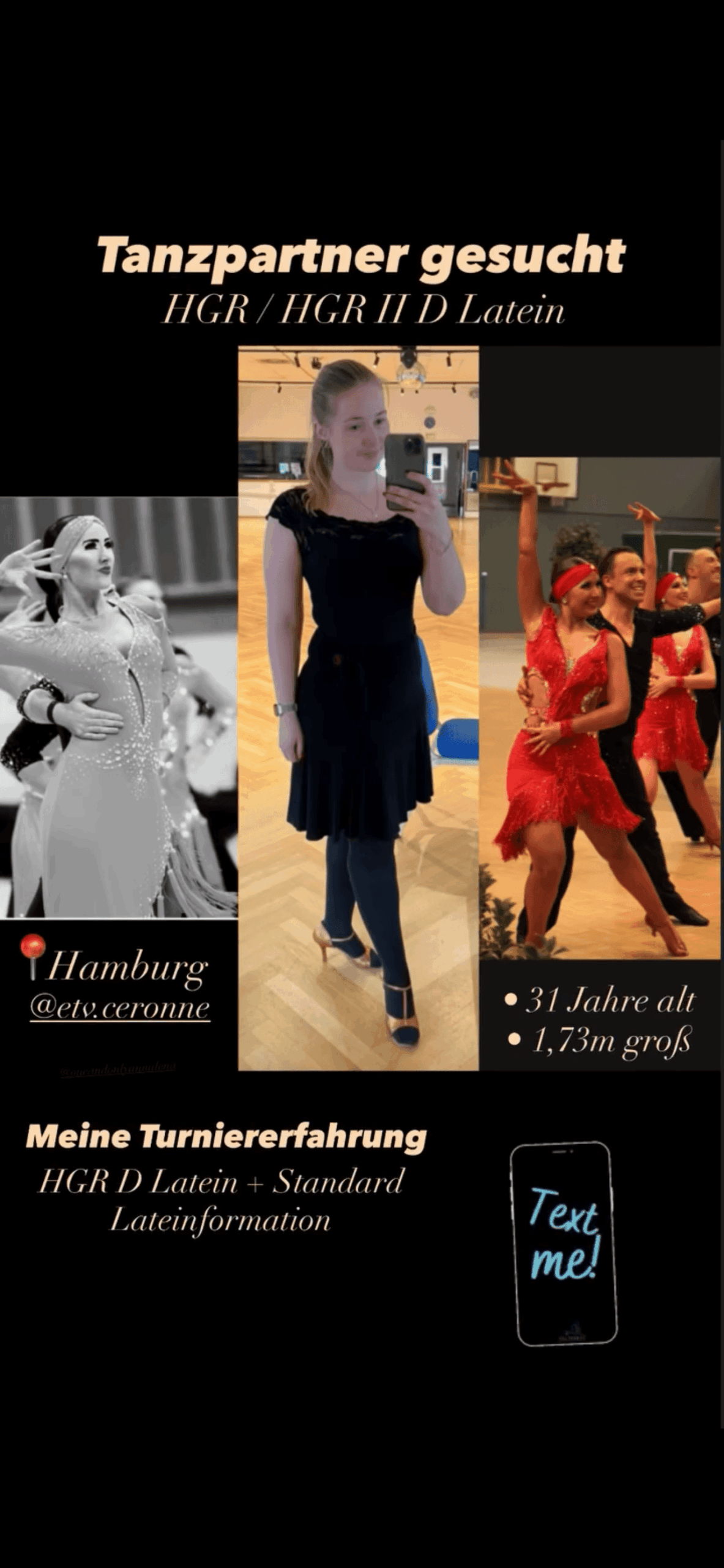 Bis vor der Pandemie habe ich schon Einzel in der HGR D Latein + Standard, sowie in einer Lateinformation getanzt. Seit 2021 bis Mitte 2025 habe ich durch Covid und dann durch meine Arbeit im Ausland pausiert.